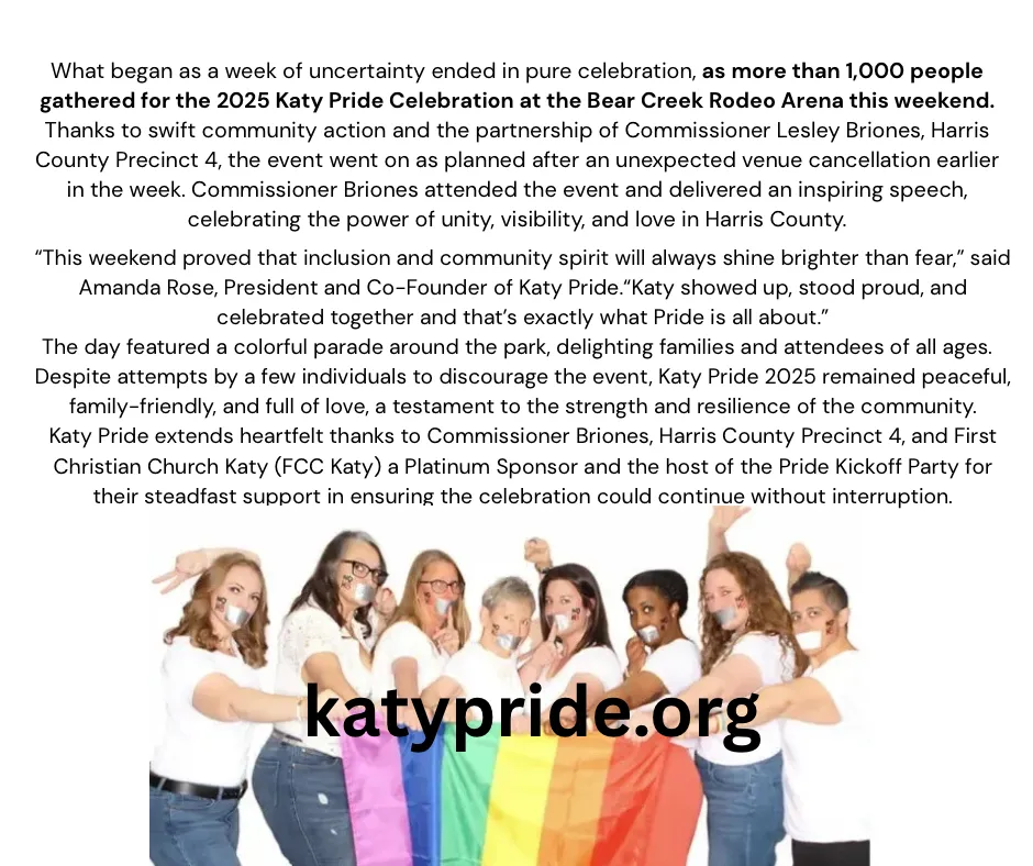 Katy Pride LGBTQ Inc. is a 501c3 non-profit that was created in June 2023 with a vision of creating a community where all LGBTQ+ individuals can live authentically and safely without persecution, judgment, hate, or fear. The goal of the organization is to empower the LGBTQ+ community in Katy and the surrounding areas by creating inclusive events, advocating for equality, and fostering a supportive community of acceptance and diversity.